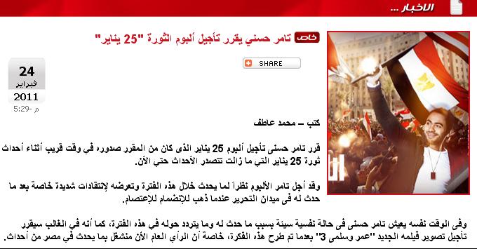 • -- تامر حسنى يقرر تأجيل البوم تورة 25 يناير