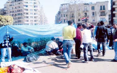 وفي السياق ذاته بدأت صباح أمس مجموعات من شباب الثورة في نصب خيامهم داخل الميدان, وعلي تخومه, وتزويدها بوحدة طبية ميدانية, وإعداد اللافتات, والتزود بالمياه والاطعمة استعدادا لمبيت ليلي دائم, ووجود نهاري متواصل في انتظار اقالة الحكومة.. أو بدء المليونية يوم الجمعة المقبل.. أيهما أقرب.