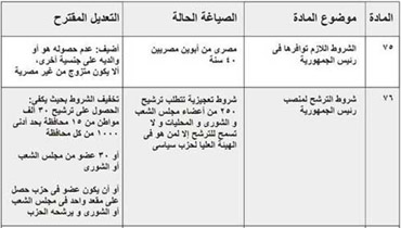 - سيكون الاستفتاء على 9 مواد فقط هي 75 و 76 و77 و88 و93 و139 و148 وإلغاء المادة 179 وإضافة فقرة للمادة 189 وإضافة مادتين 189 مكرر و 189 مكرر 1.