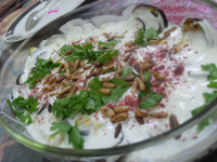 يخلط الباذنجان مع الزبادي والثوم والليمون المعصور والكمون والملح حسب الرغبة.